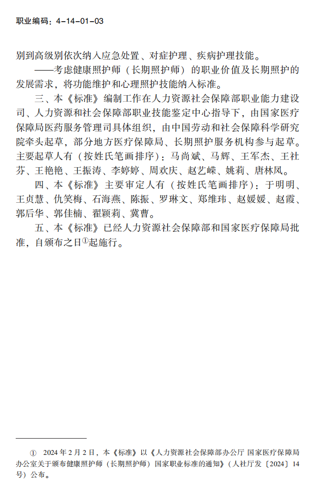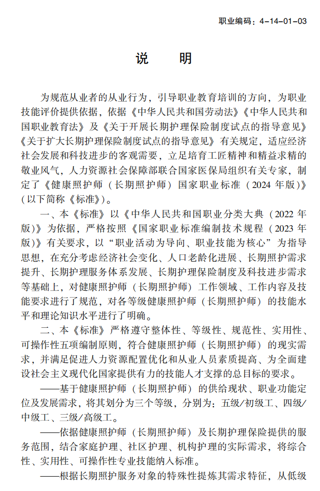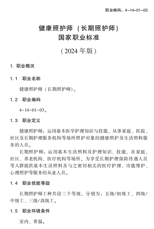 根据《中华人民共和国劳动法》有关规定,人力资源社会保障部、国家医疗保障局共同制定了健康照护师(长期照护师)国家职业标准,现予颁布施行。