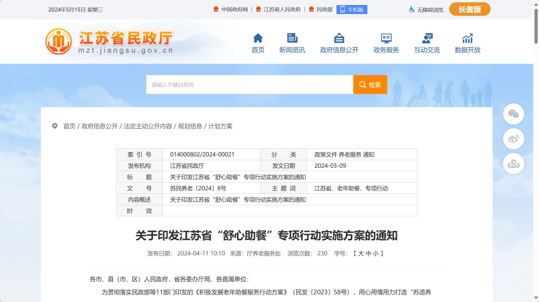 江苏省“舒心助餐”专项行动实施方案