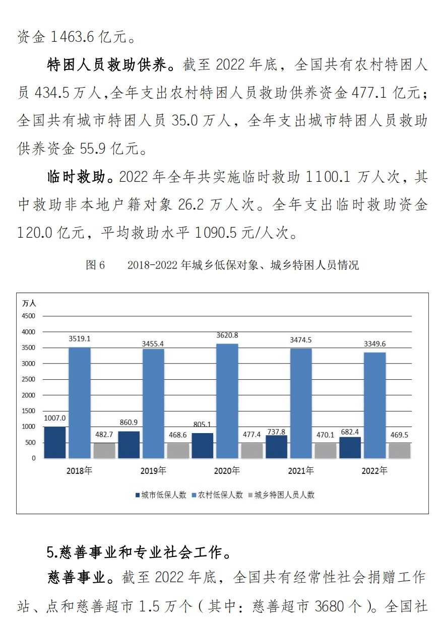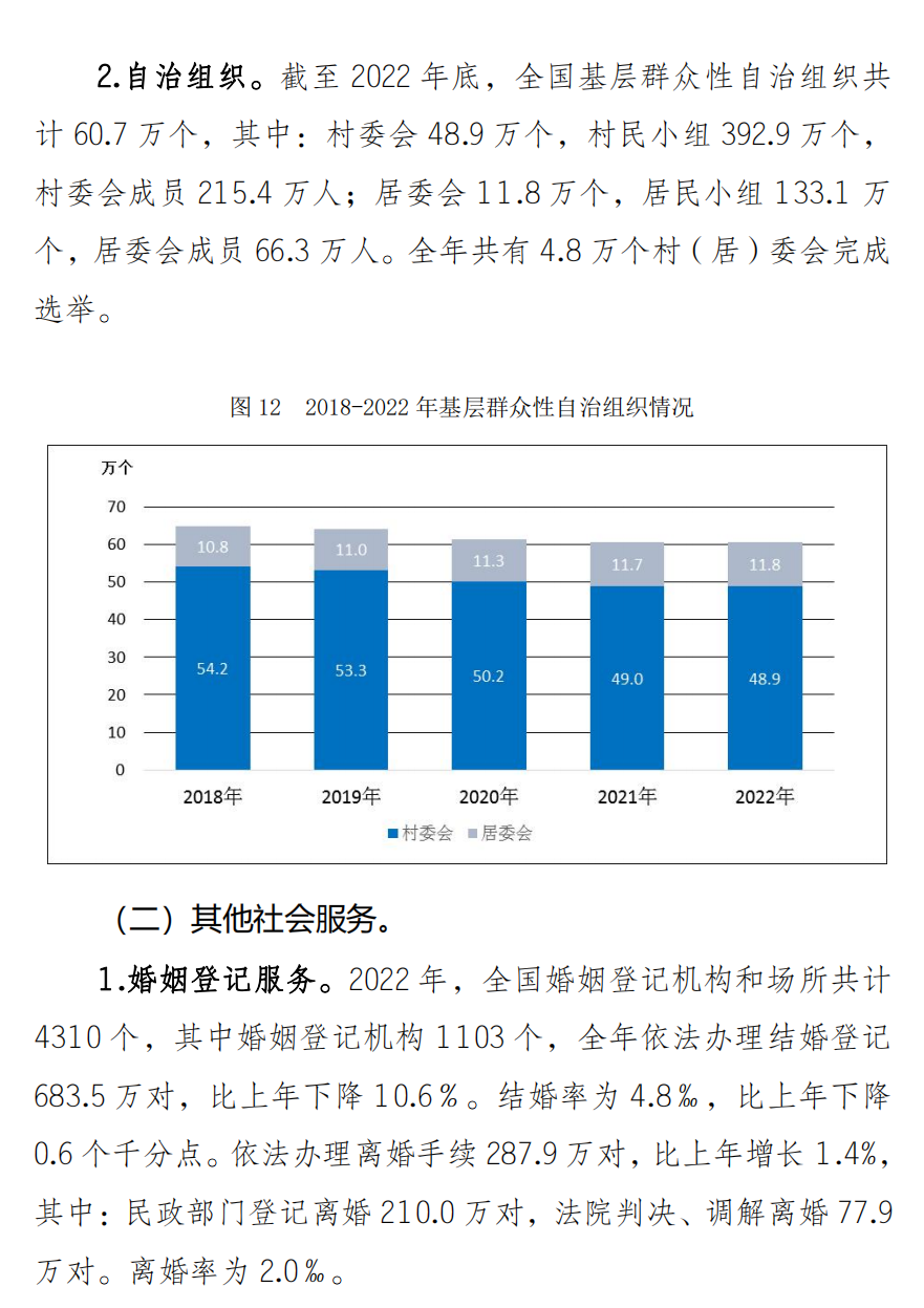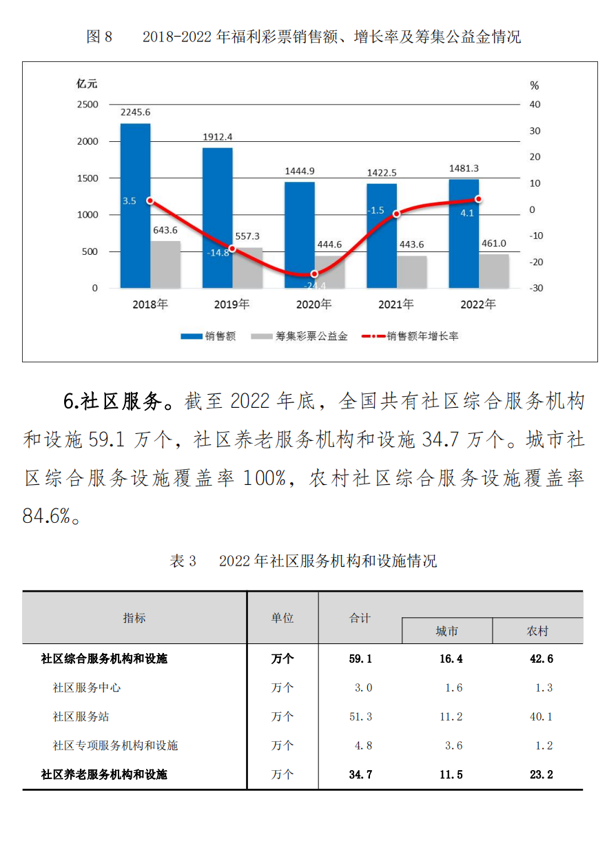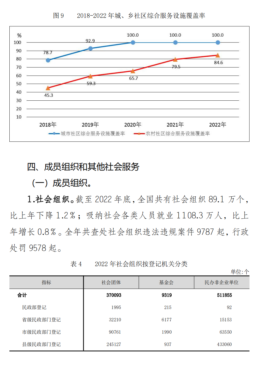 截至2022年底,全国共有社区综合服务机构和设施59.1万个,社区养老服务机构和设施34.7万个。城市社区综合服务设施覆盖率100%,农村社区综合服务设施覆盖率84.6%。