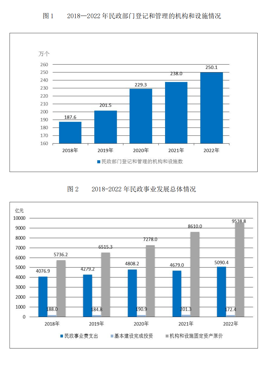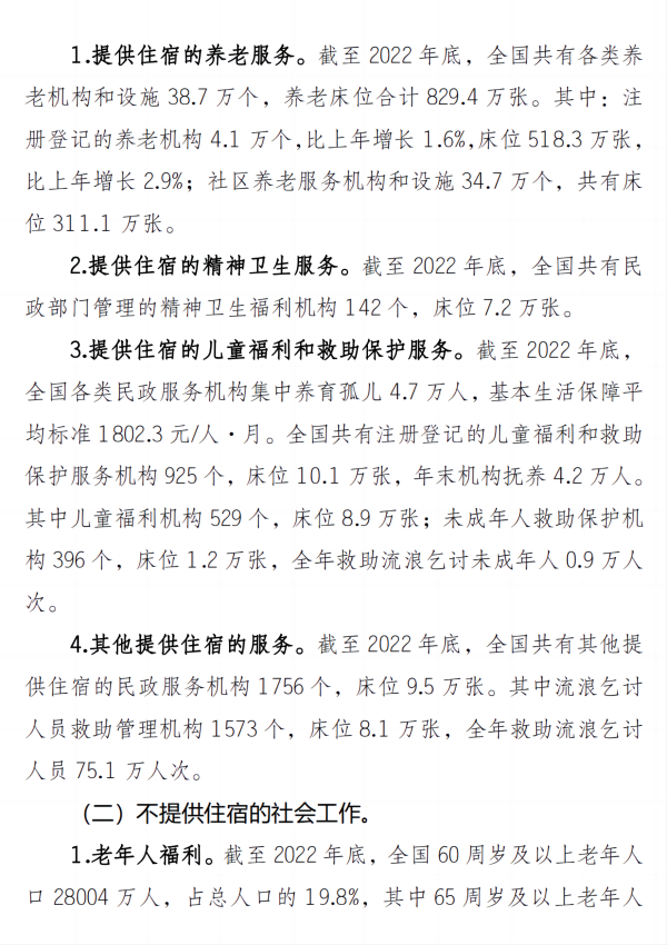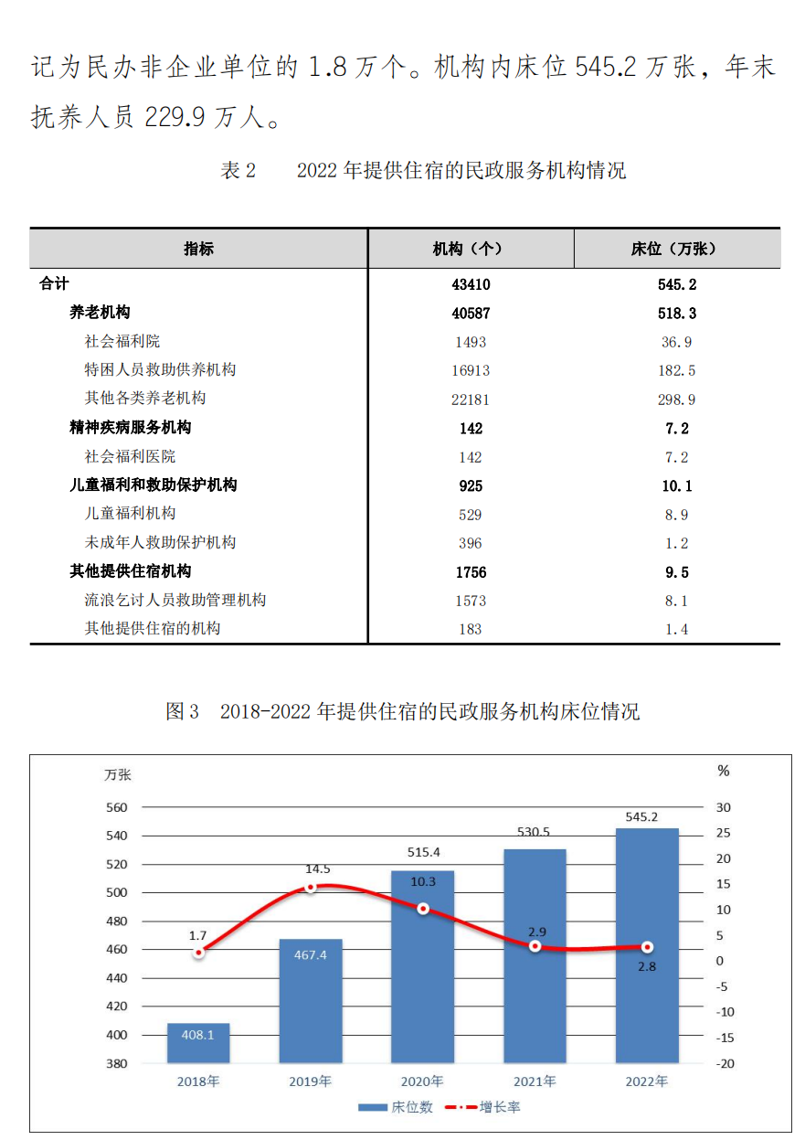 截至2022年底,全国共有各类养老机构和设施38.7万个,养老床位合计829.4万张。其中,注册登记的养老机构4.1万个,比上年增长1.6%,床位518.3万张, 比上年增长2.9%;社区养老服务机构和设施34.7万个,共有床位311.1万张。