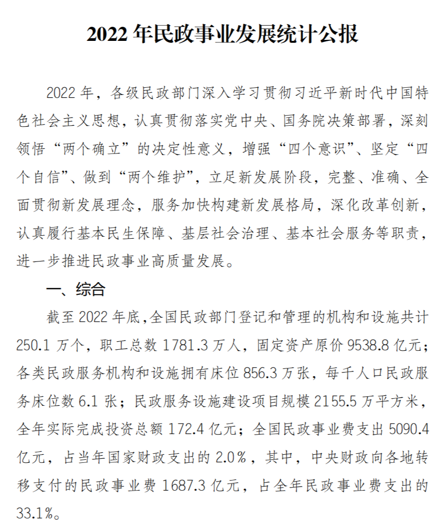 截至2022年底,全国共有4143万老年人享受老年人补贴,其中享受高龄补贴的老年人3406.4万人,享受护理补贴的老年人94.4万人,享受养老服务补贴的老年人574.9万人,享受综合补贴的老年人67.4万人。全国共支出老年福利资金423.0亿元,养老服务资金170.1亿元。