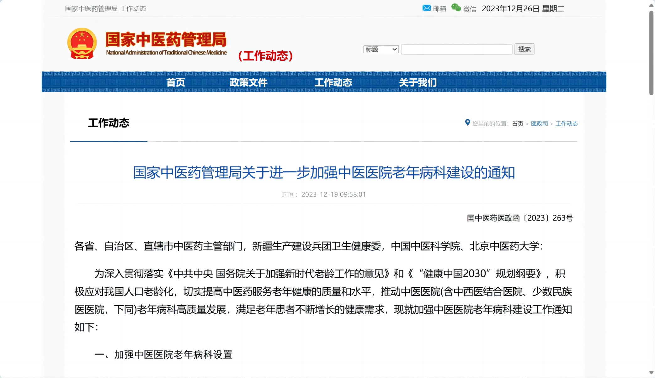 为深入贯彻落实《中共中央 国务院关于加强新时代老龄工作的意见》和《“健康中国2030”规划纲要》,积极应对我国人口老龄化,切实提高中医药服务老年健康的质量和水平,推动中医医院(含中西医结合医院、少数民族医医院,下同)老年病科高质量发展,满足老年患者不断增长的健康需求,现就加强中医医院老年病科建设工作通知如下:
