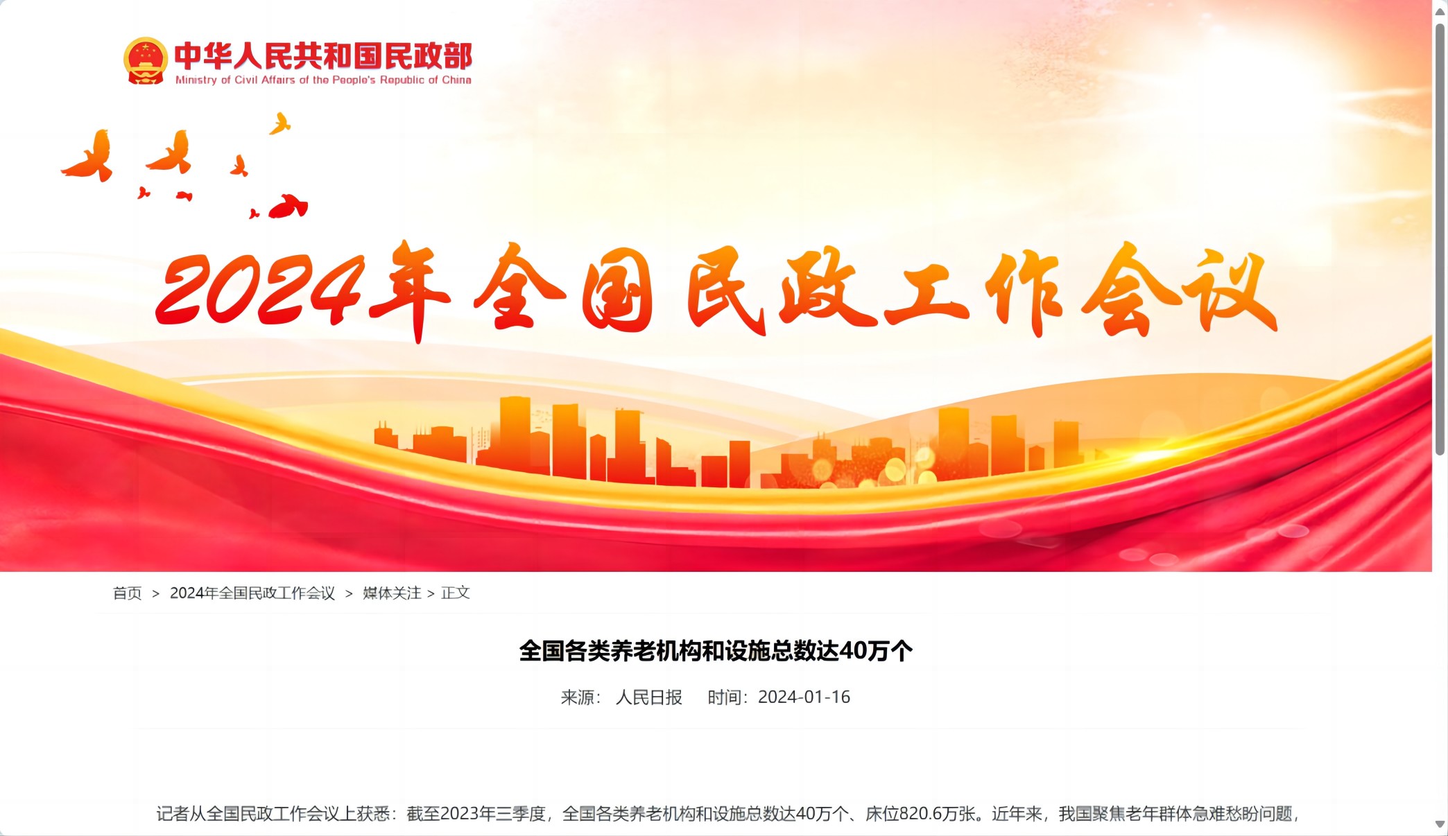 记者从全国民政工作会议上获悉:截至2023年三季度,全国各类养老机构和设施总数达40万个、床位820.6万张。近年来,我国聚焦老年群体急难愁盼问题,有效满足老年人多层次、多样化养老服务需求,养老服务供给更趋优化。