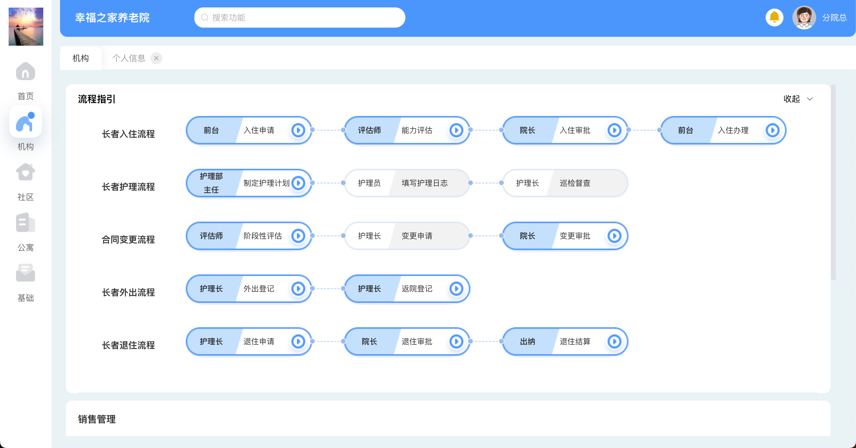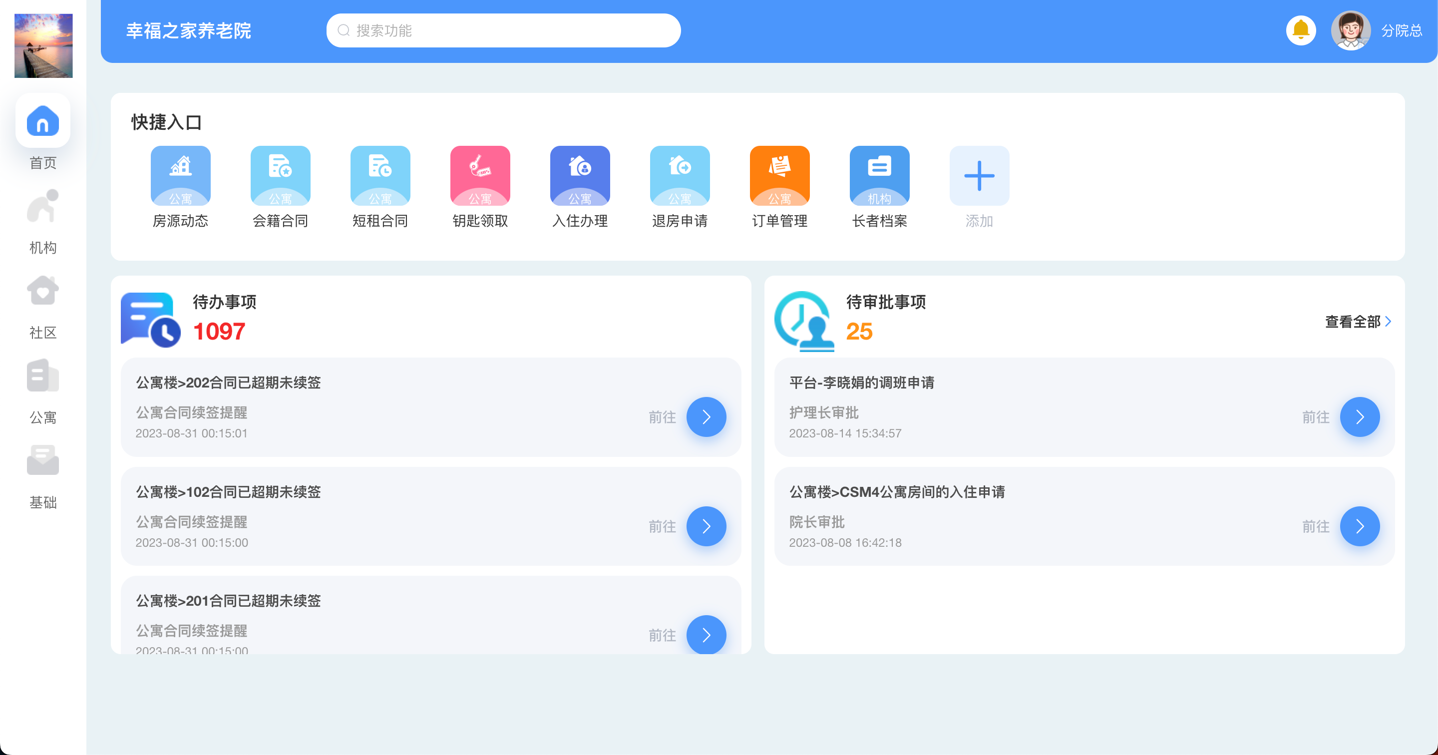 本次UI设计升级注重提升用户体验,以简洁、易用、美观为主导思想,对后台菜单进行整合,仅保留首页、机构服务模块、居家服务模块、公寓服务模块、基础配置模块,根据用户订阅的模块内容开放功能权限,通过减少冗余元素,使用户更快地找到所需功能,提高操作效率。