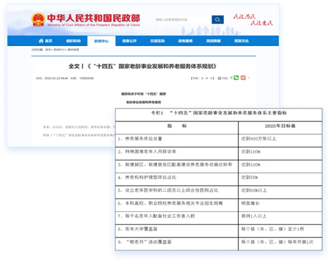 《规划》提出了「十四五」时期的发展目标,即养老服务供给不断扩大,老年健康支撑体系更加健全,为老服务多业态创新融合发展,要素保障能力持续增强,社会环境更加适老宜居;并明确了养老服务床位总量、养老机构护理型床位占比等 9 个主要指标,推动全社会积极应对人口老龄化格局初步形成,老年人获得感、幸福感、安全感显著提升。